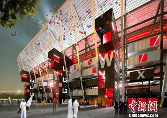 將在下屆卡塔爾***投用的拉斯阿布阿布德體育場(chǎng)效果圖,這一世界首座集裝箱模塊化大型體育場(chǎng)由中國參建。中集集團(tuán)供圖